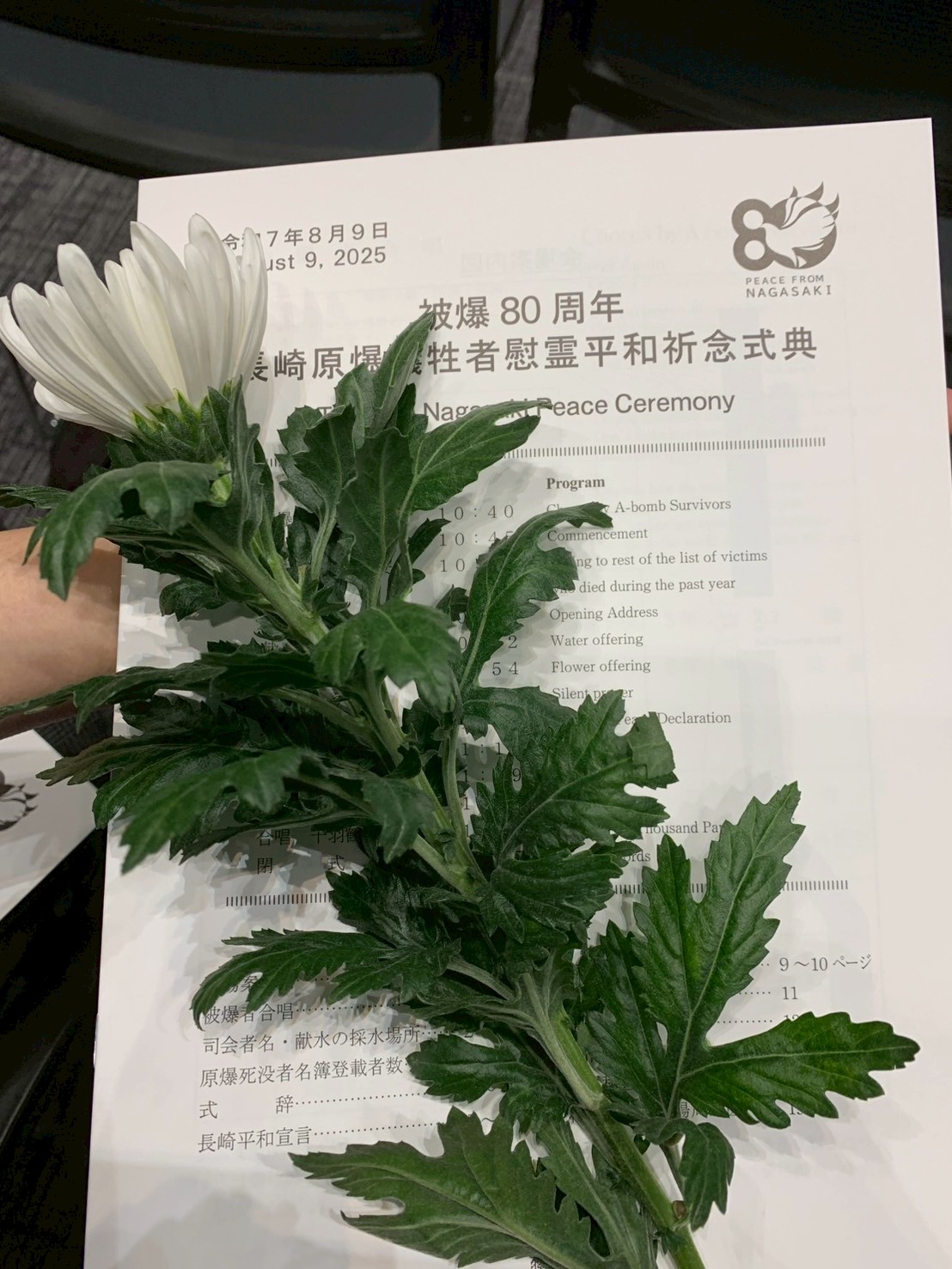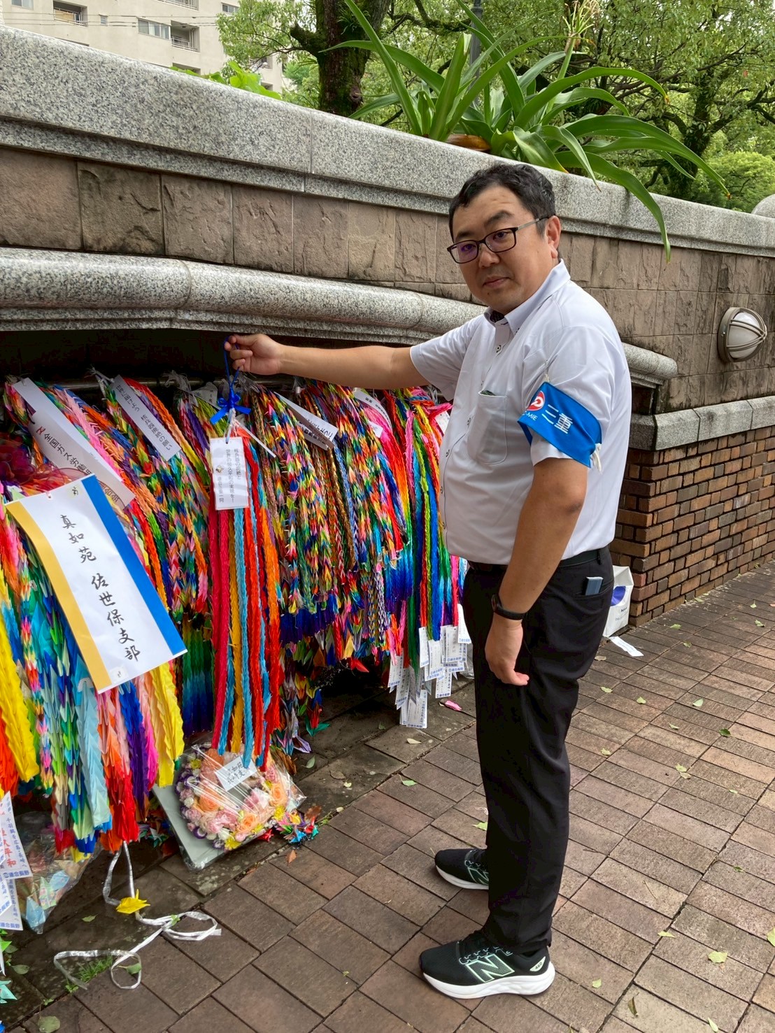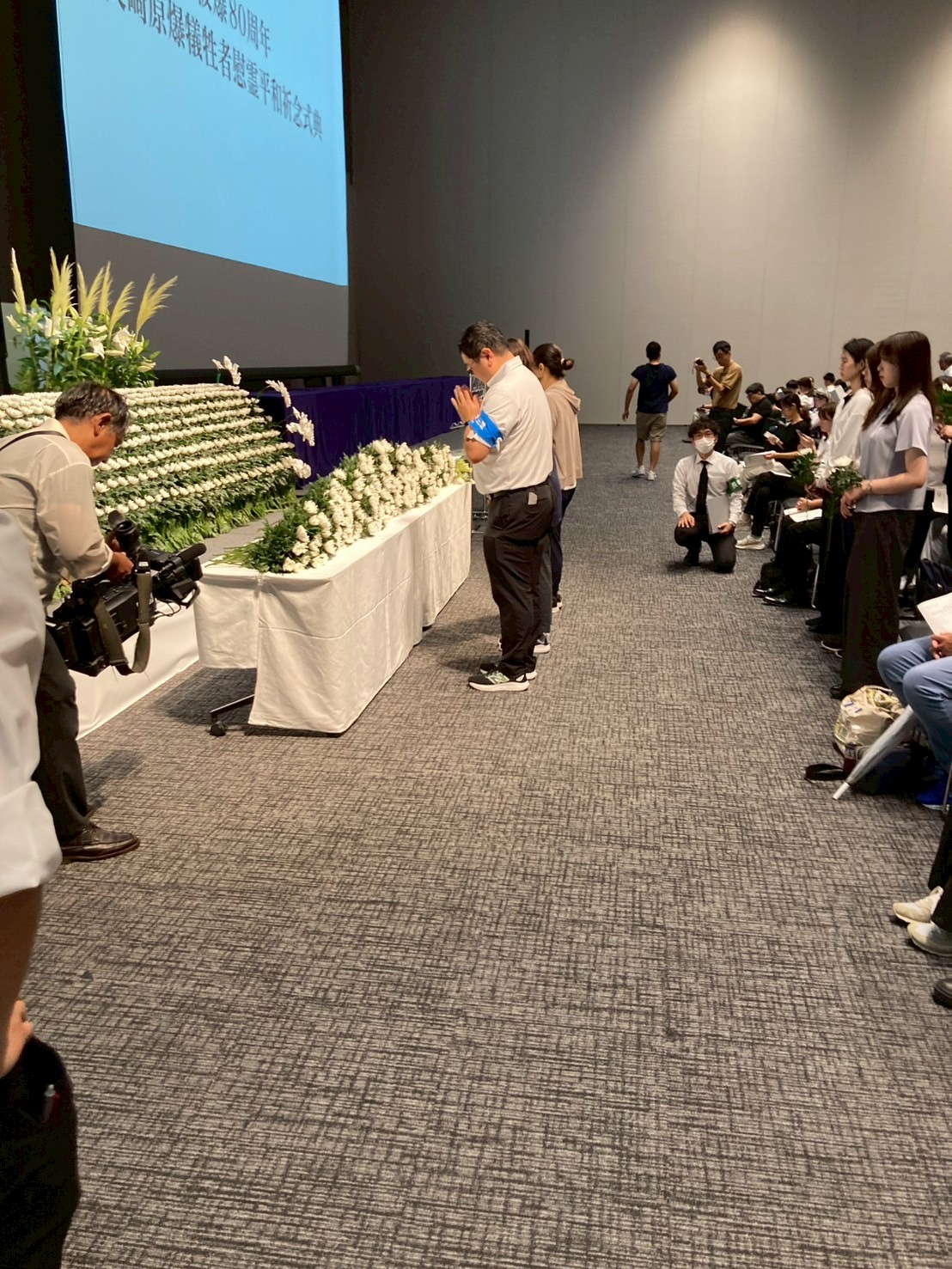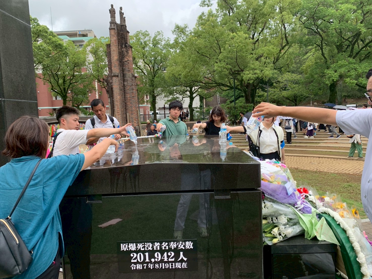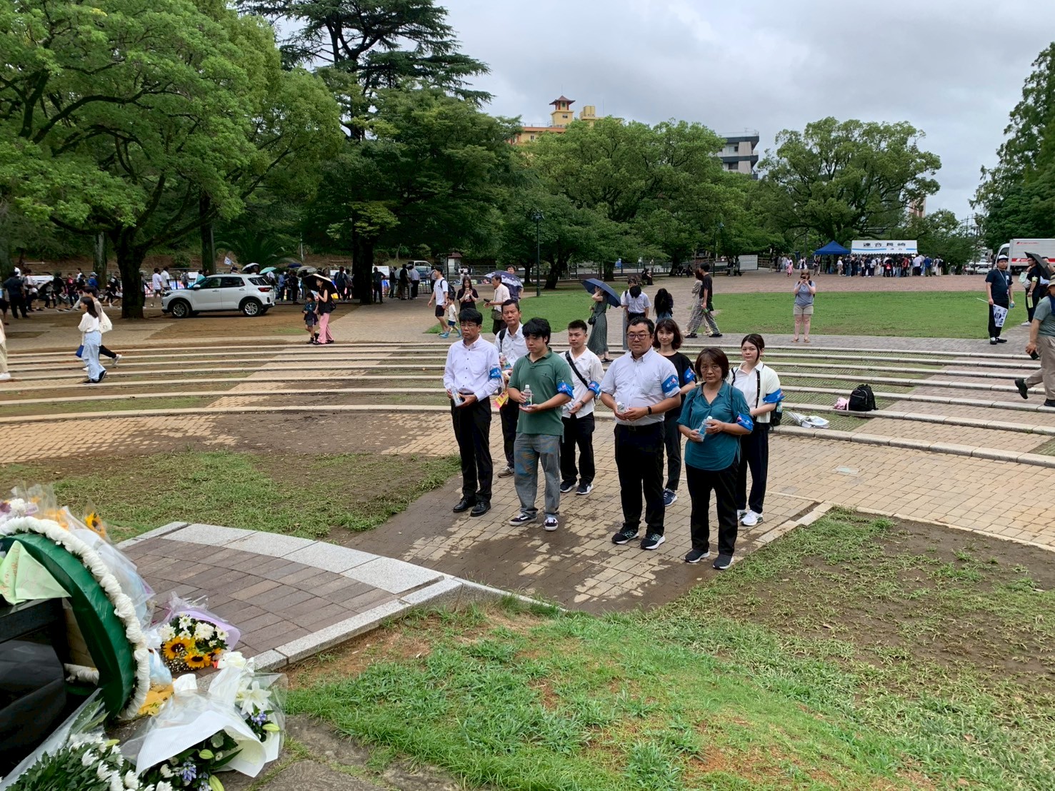 9日は、サテライト会場で「被爆80周年長崎原爆犠牲者慰霊平和祈念式典」に参加し、原爆投下の11時2分に黙とうと献花を行い、核兵器廃絶と世界恒久平和の実現を誓いました。午後から爆心地公園で連合三重の構成組織・地協で作成した折鶴の献納と献水をした後、ピースウォークに参加し、連合長崎青年委員会の説明を受けながら平和公園や平和の泉、原爆落下中心地碑などを巡り、被爆の実相を学びました。