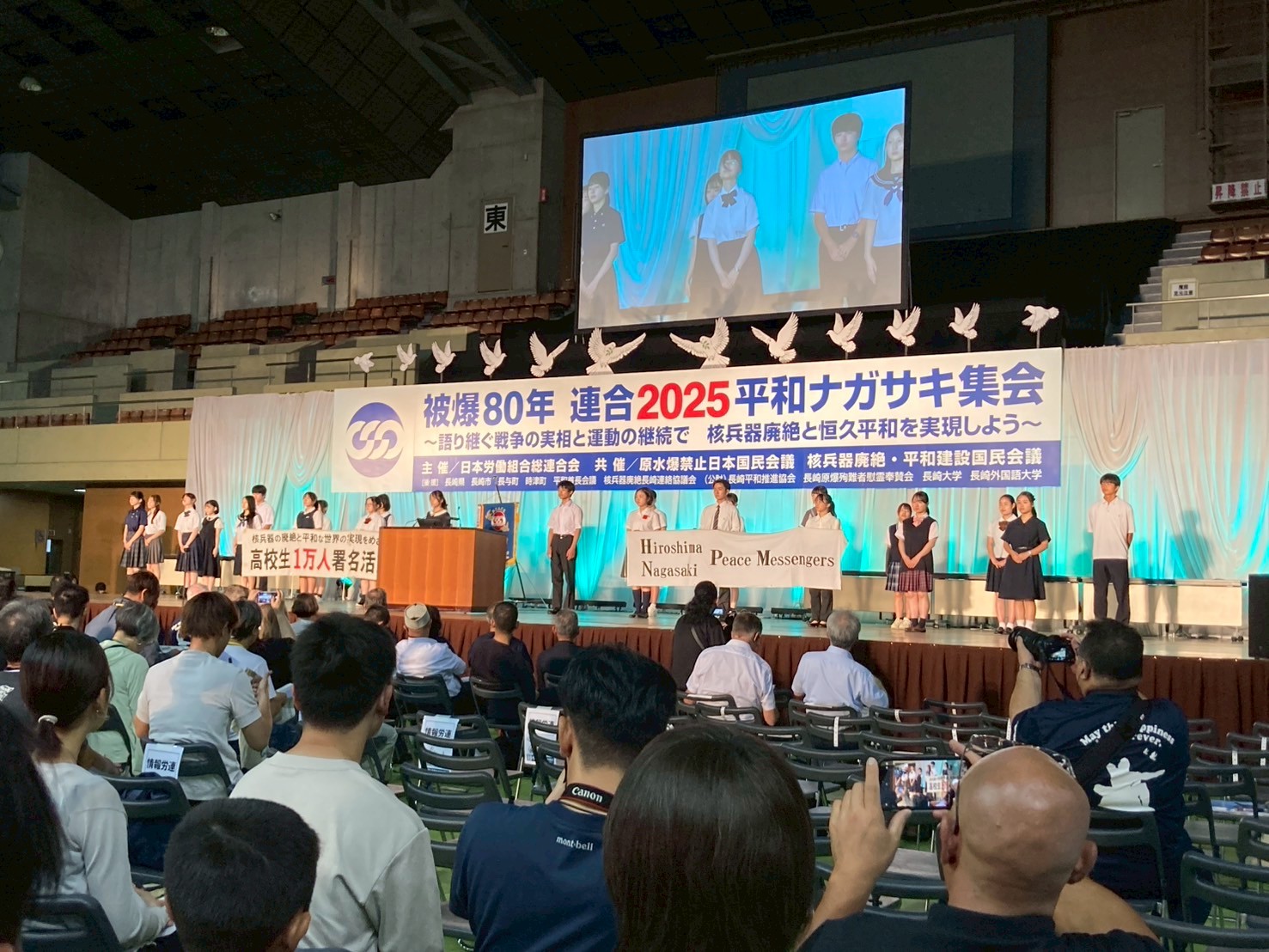 8日は、「被爆80年連合2025平和ナガサキ集会」に参加し、被爆者の訴えや「国際政治と核兵器の現状」の演題で講演や若者からのメッセージを聞き、平和アピールを確認しました。