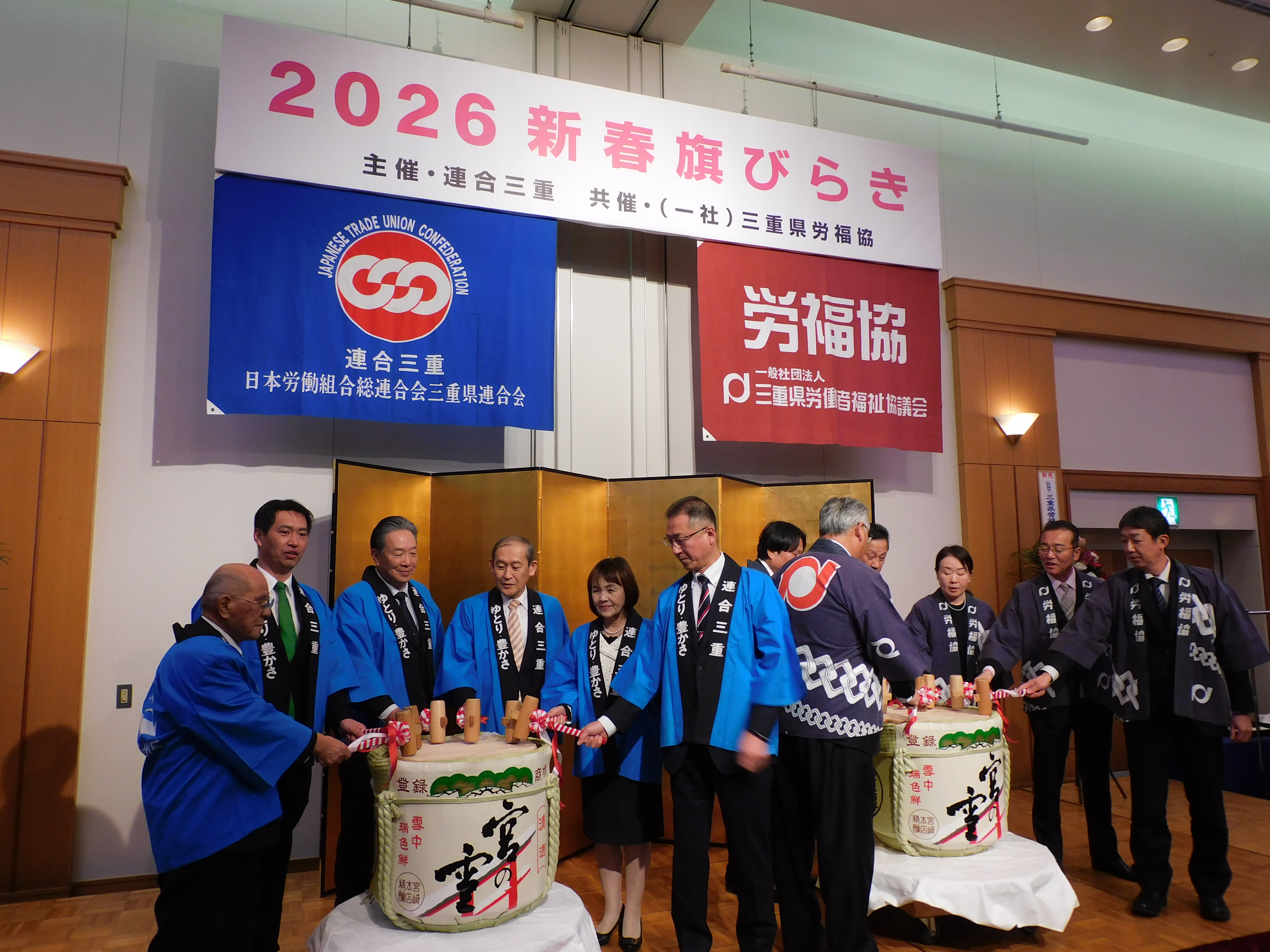 1月6日、グリーンパーク津において、各構成組織と地協ならびに、関係団体の代表者約300名の参加を得て「2026新春旗びらき」を開催しました。