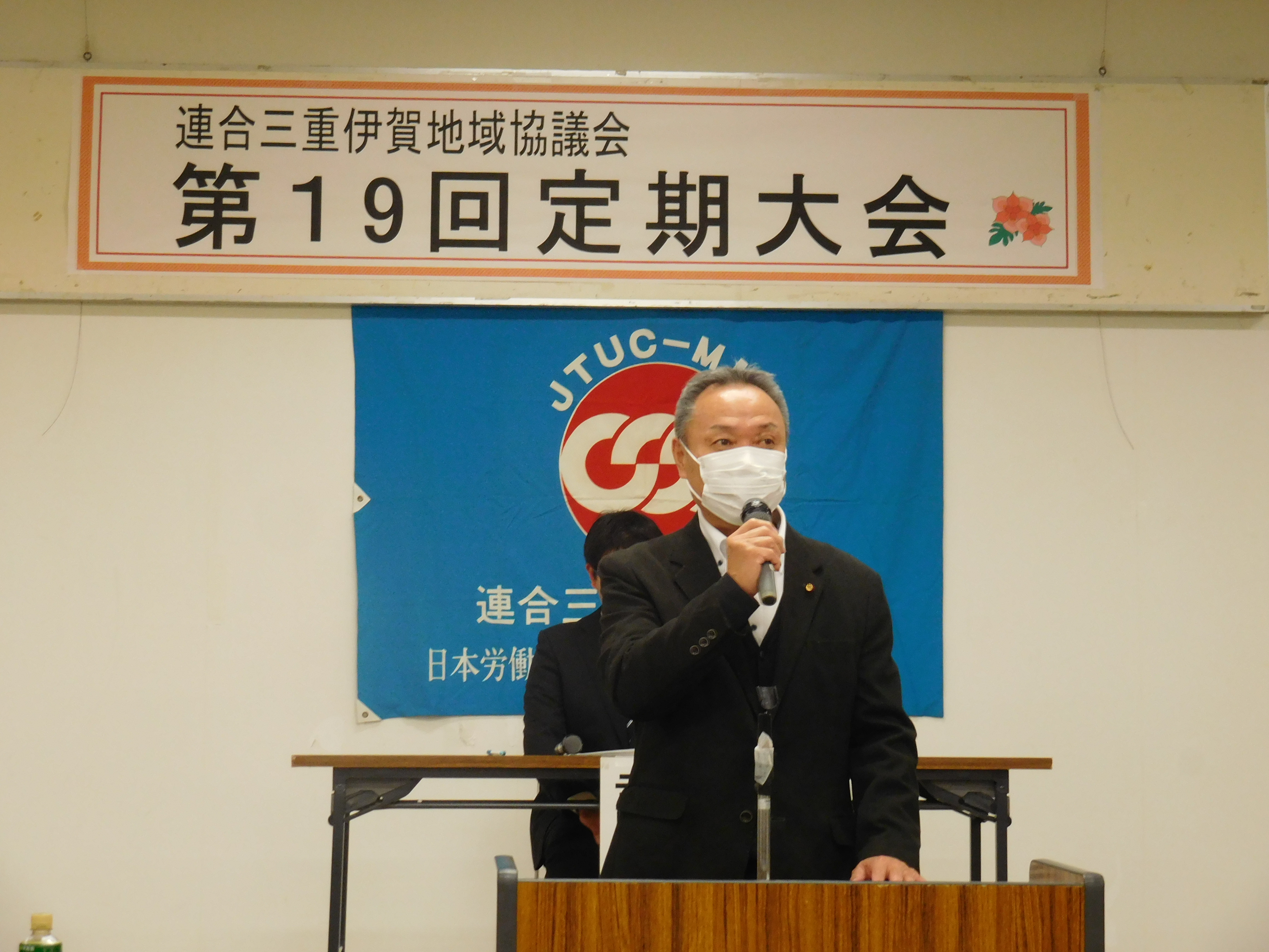冒頭 水岡議長から「昨年の臨時大会以降 新型コロナの分類変更により、発生時前の活動に徐々に近づけられるように活動を行ってきた。活動の質を低下させることなく、感染症にも考慮してきた1年であった。本大会では『働くことを軸とする安心社会にーまもる・つなぐ・創り出すー』の実現に向けた、向こう2年間の活動について真摯な議論をお願いする」と挨拶があり、その後 連合三重 廣瀬純子副事務局長はじめ岡本栄伊賀市長・荊原広樹県議会議員・永岡禎名張市議会議員・次期衆議院選候補予定者「しもの幸助氏」からご挨拶をいただきました。