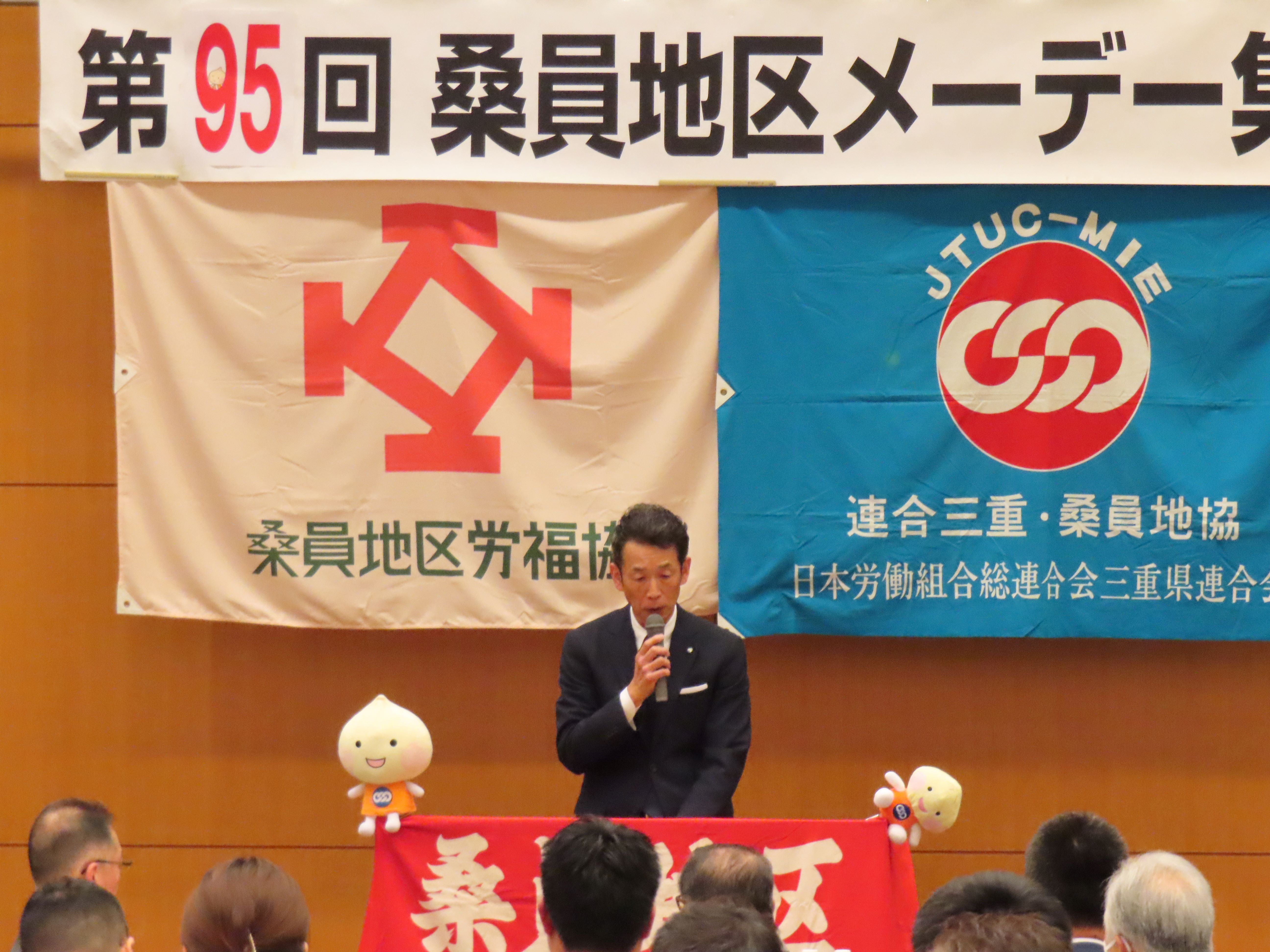 第95回桑員地区メーデー集会が、4月26日(金)18:15より、「くわなメディアライヴ多目的ホール」において、総勢121名(ご来賓含む)の参加者のもと盛会に開催されました。