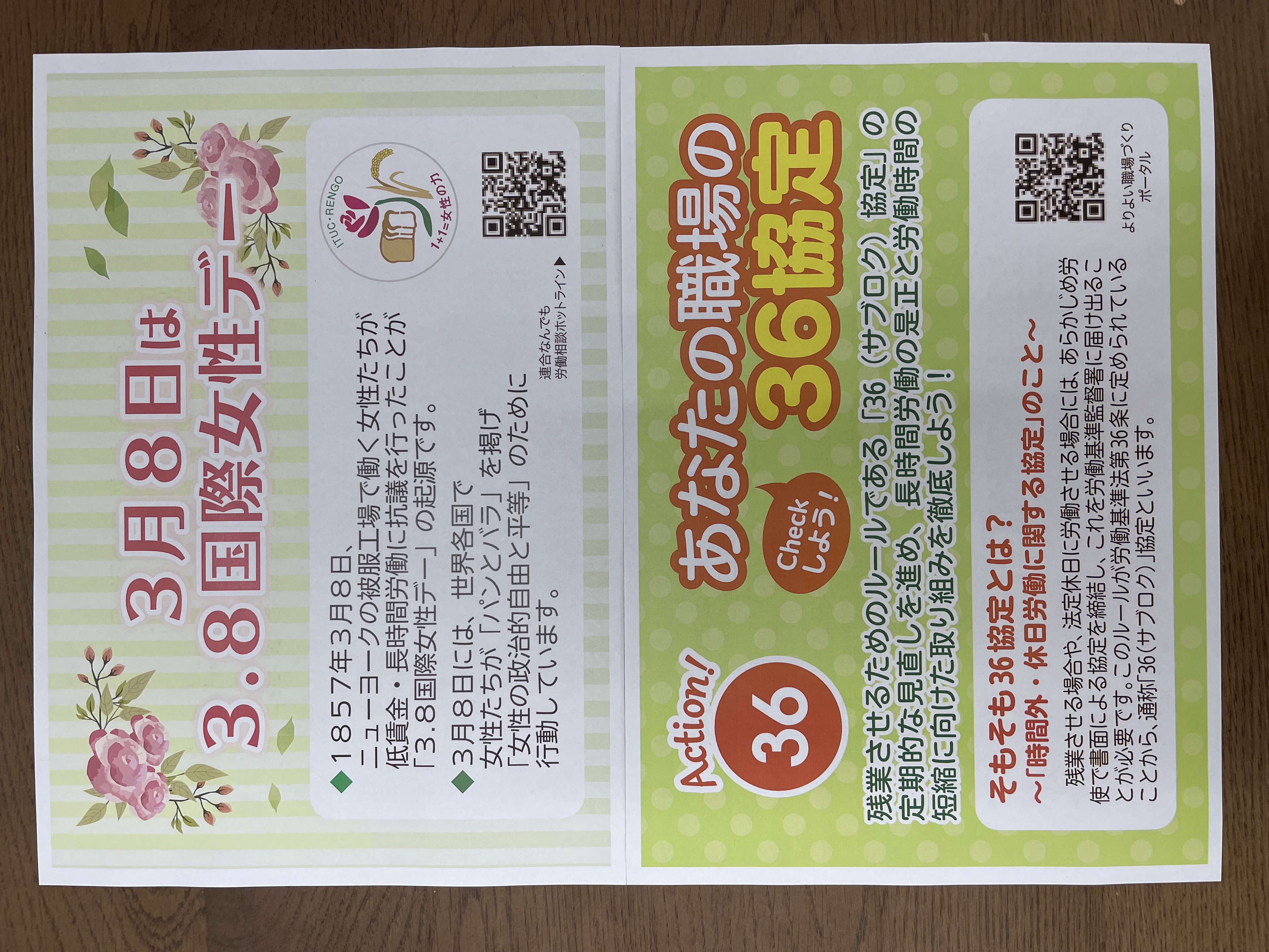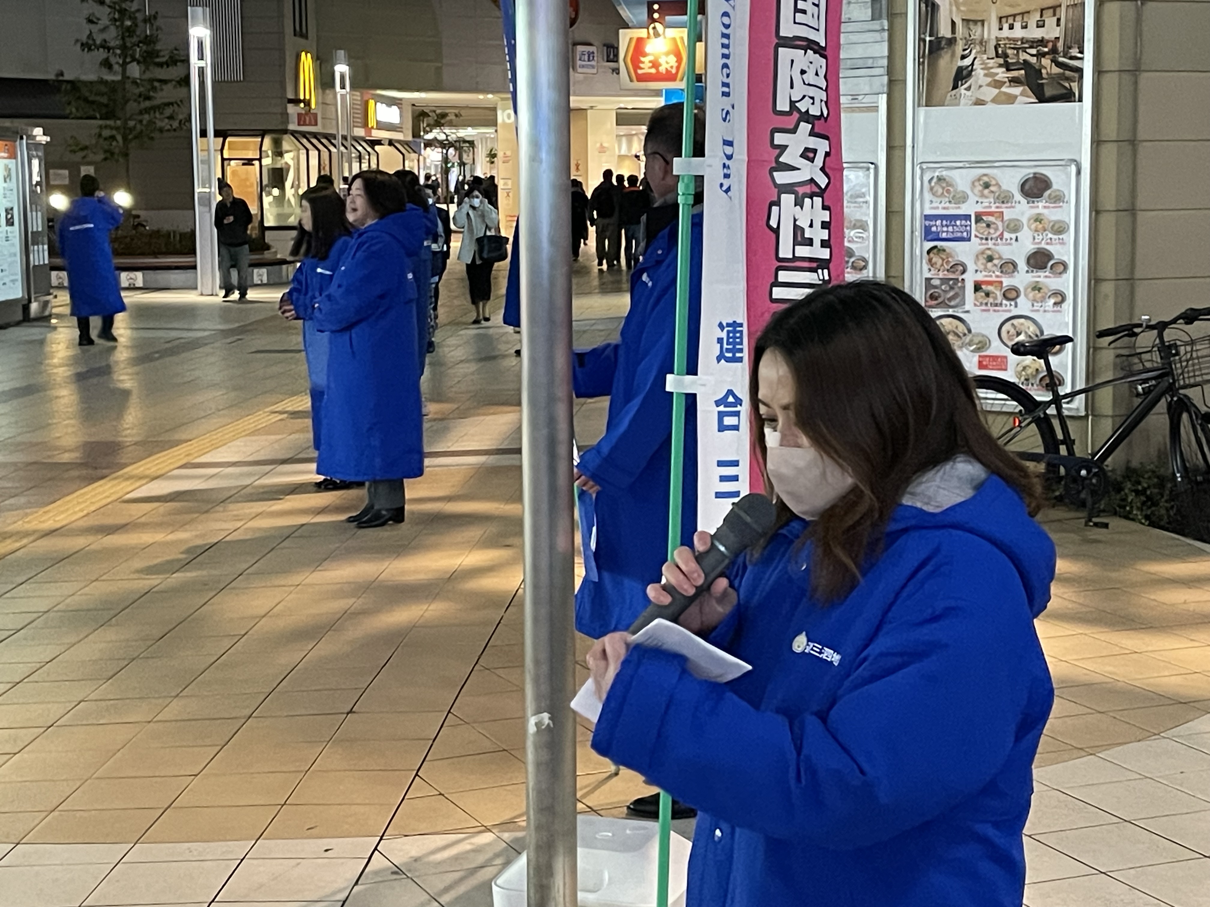 3月5日(水)、近鉄四日市駅ふれあいモールにおいて、連合の日統一街頭宣伝行動(3.8国際女性デー)を実施しました。 『3月8日は国際女性デー、女性の権利と平等のために行動する記念日』ということで、三泗地協参加者34名中、地協女性部役員他16名の女性に参加・協力をいただきました。夕刻買い物等で多くの市民が行き交う中、チラシ入りポケットティッシュを配布し、男女がともにいきいきと働き続けられる社会、ジェンダー・多様性を認め合う社会の実現を訴えました。