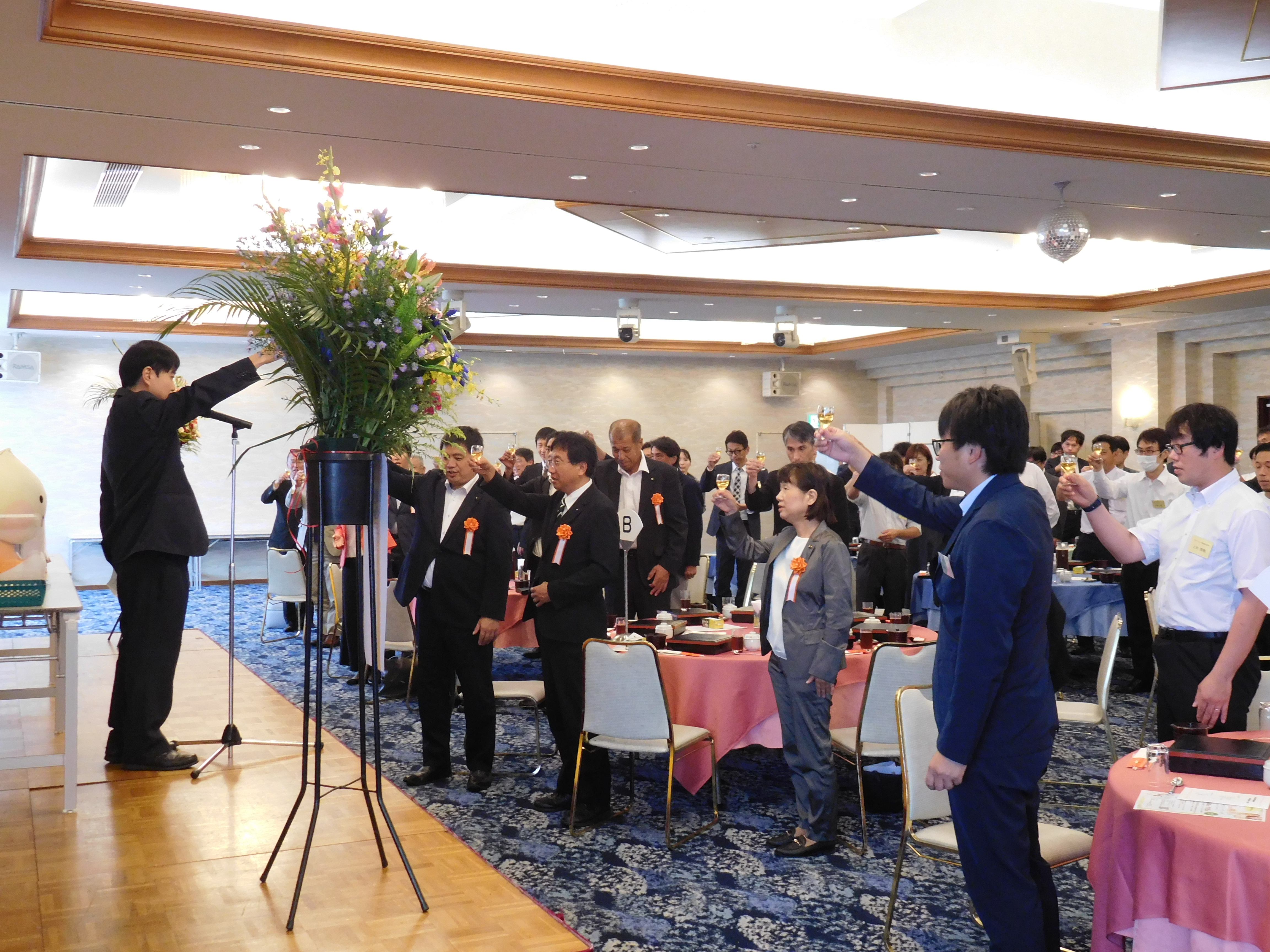式典後、西田副議長の乾杯で始まった記念パーティーの中では、抽選会も行いました。最初に第6代議長をお務めいただきました梶田勝則様に、「歴代議長賞」を抽選していただきました。梶田様からはコロナ期の難しい地協運営について、貴重なお話をお伺いすることができました。