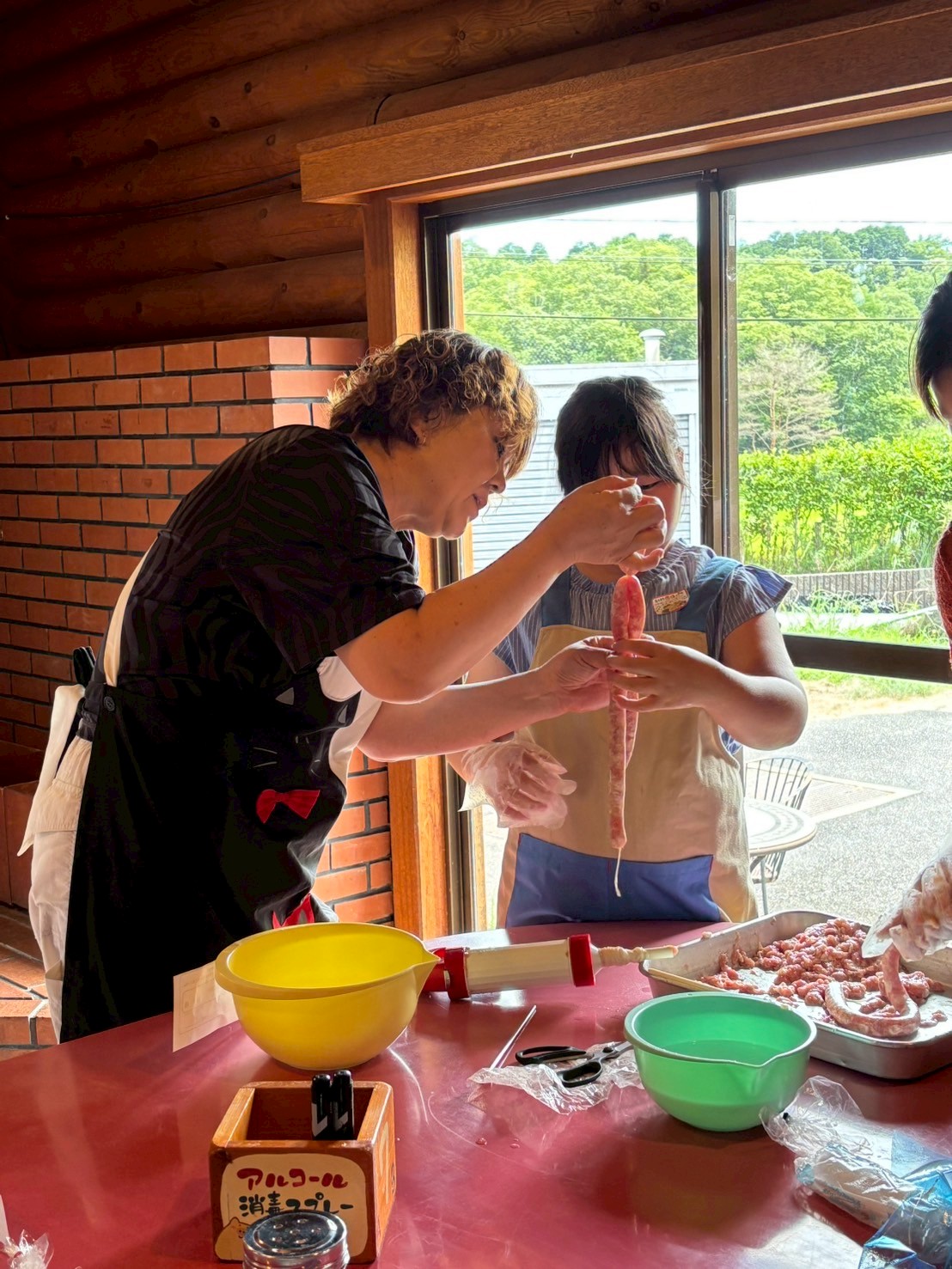 腸詰め作業は空気が入らないよう、そしてお肉を入れすぎないよう(入れすぎると茹でたときに破裂!)気を付けながら腸を優しくひっぱります(それがなかなか難しい💦)