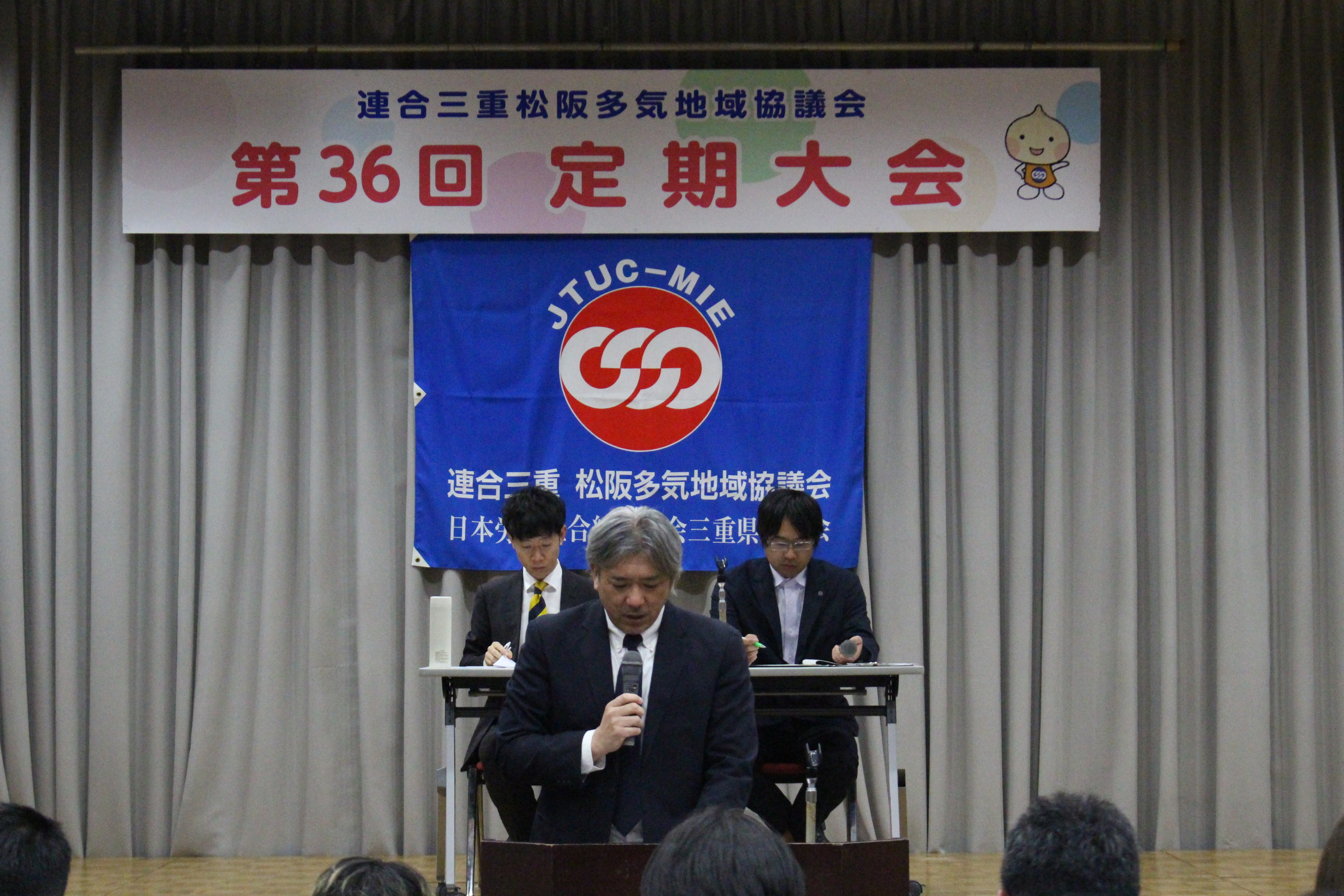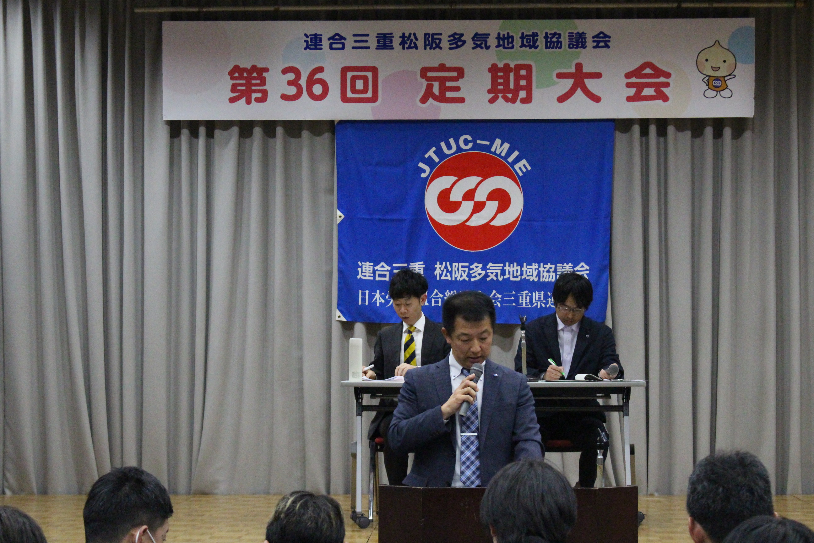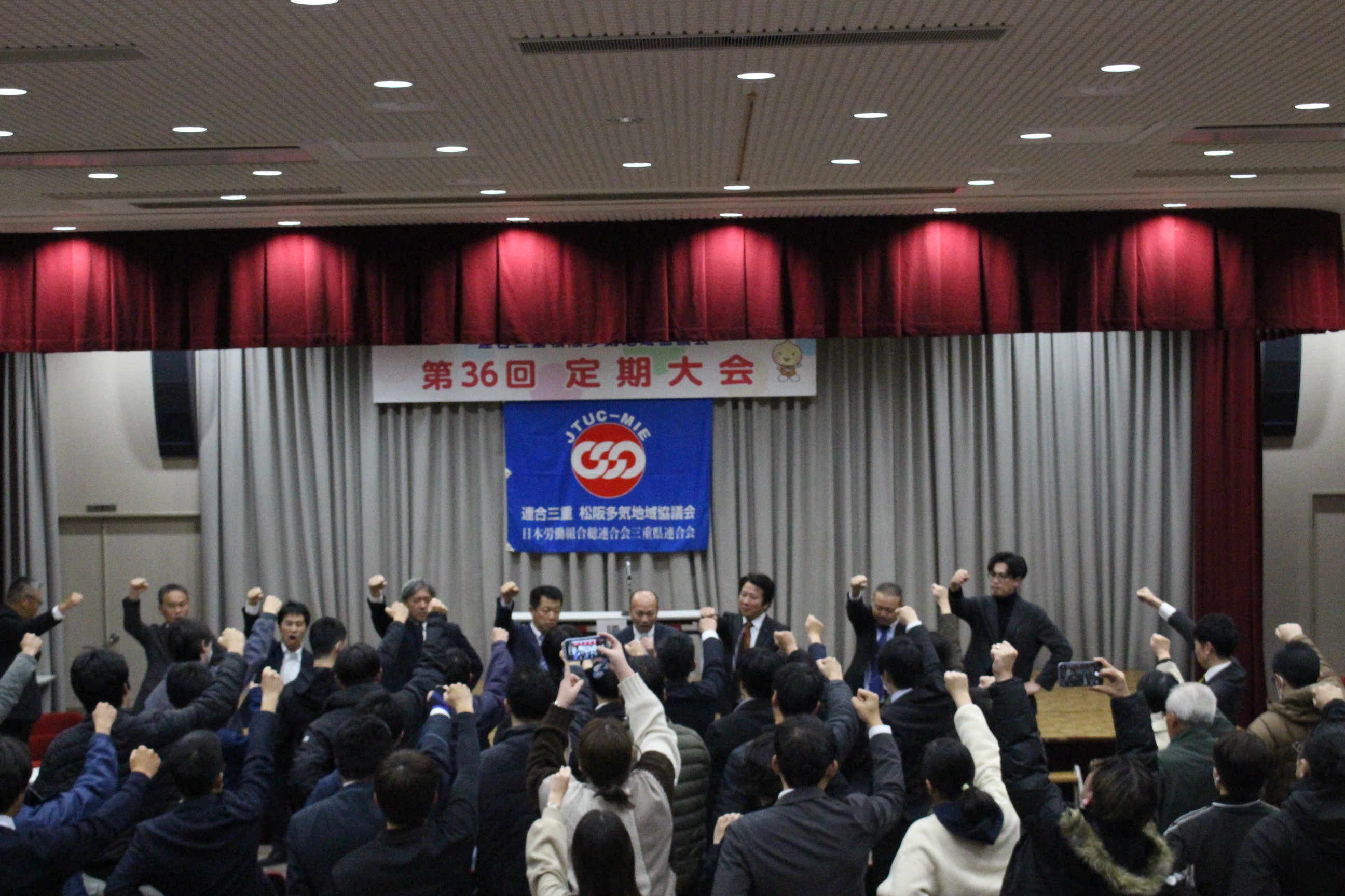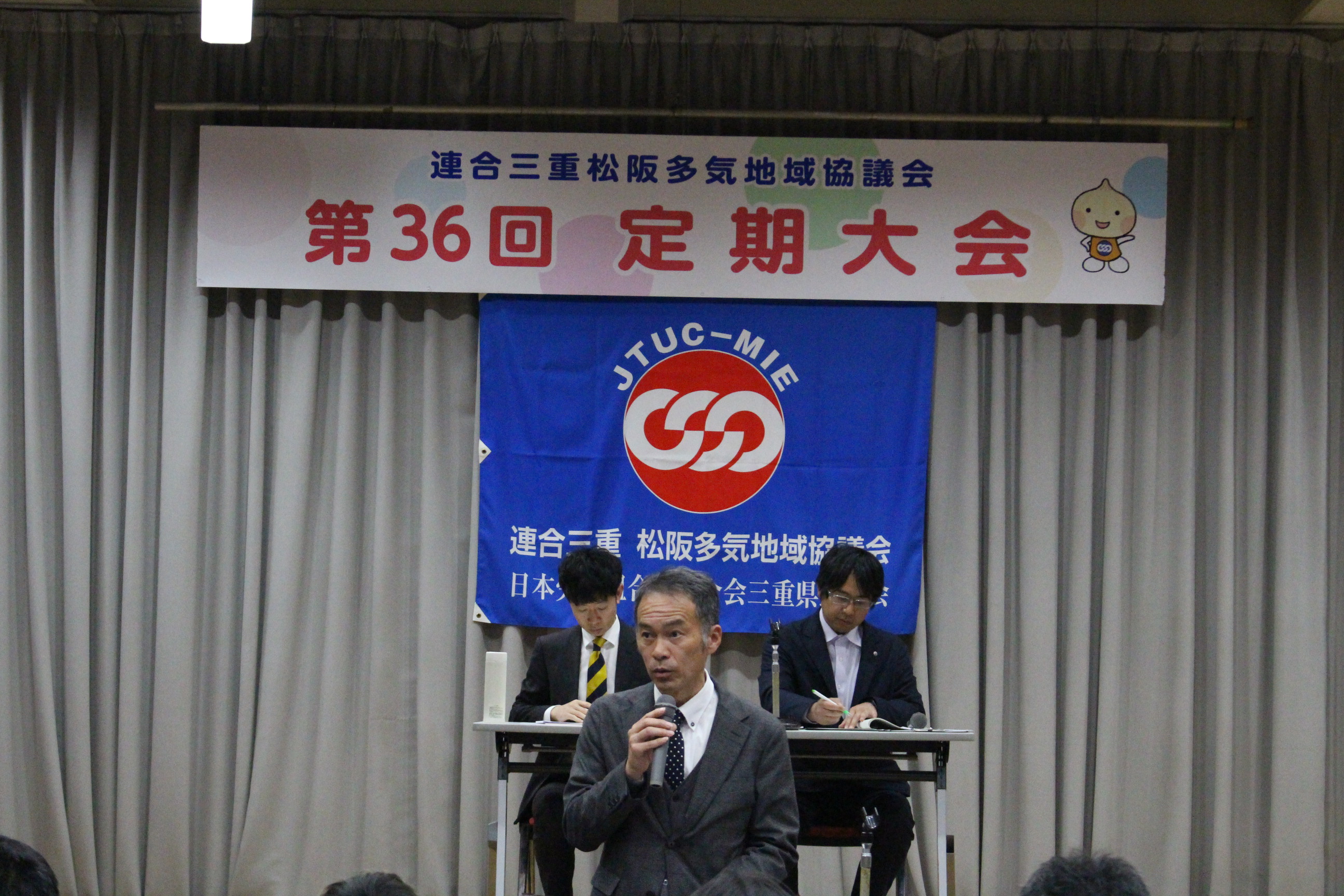 12月8日(月)18時30分より、松阪市産業振興センターにおいて、連合三重松阪多気地域協議会は第36回定期大会を開催し、代議員50人が参加しました。