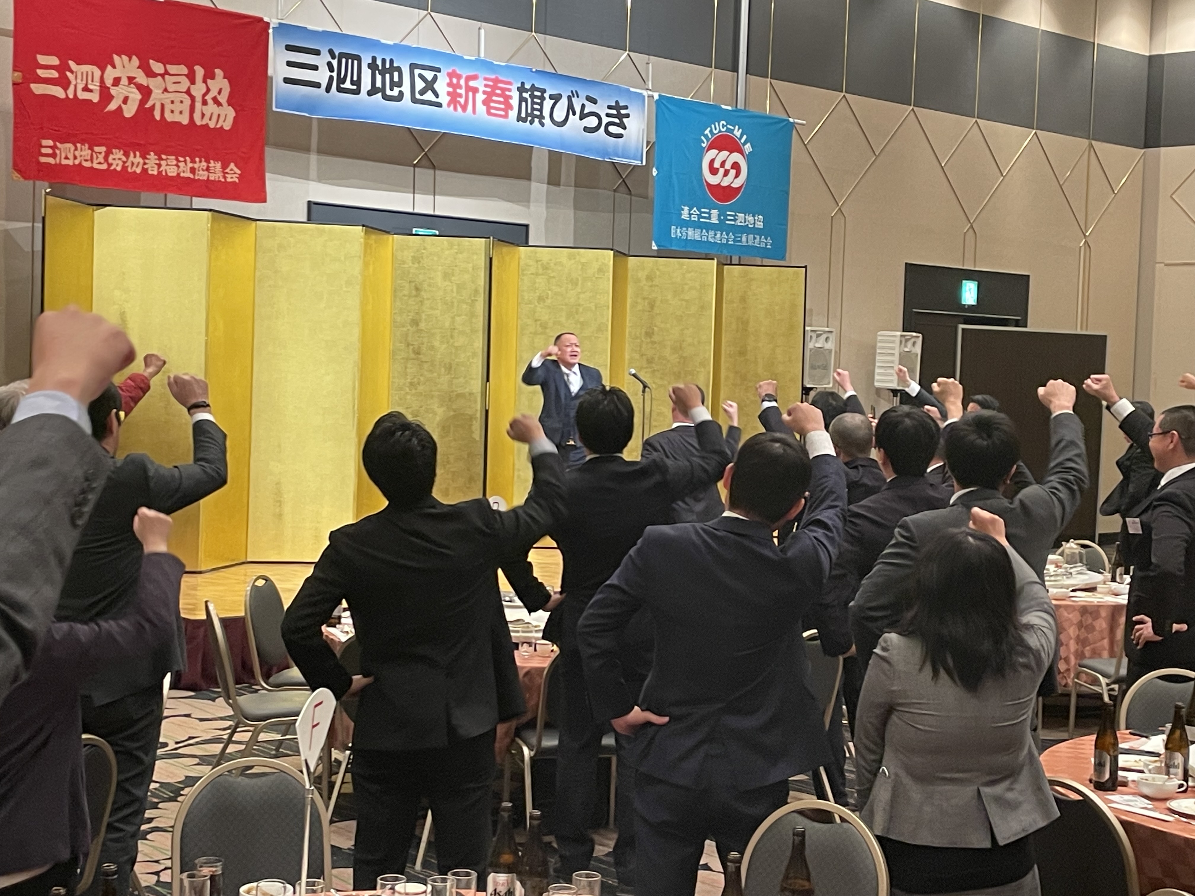 2026年最初の行事として、去る1月9日(金)都ホテル四日市において、39単組117名(来賓含む)が参加し、「2026年三泗地区新春旗びらき」を盛大に開催しました。