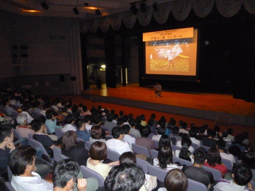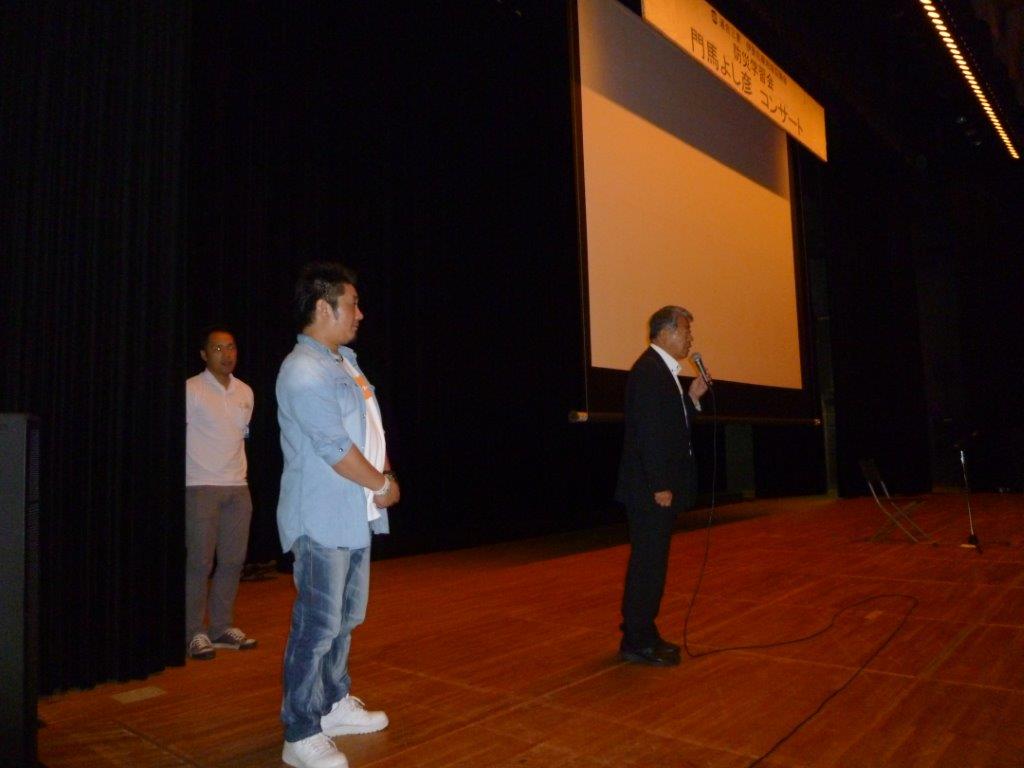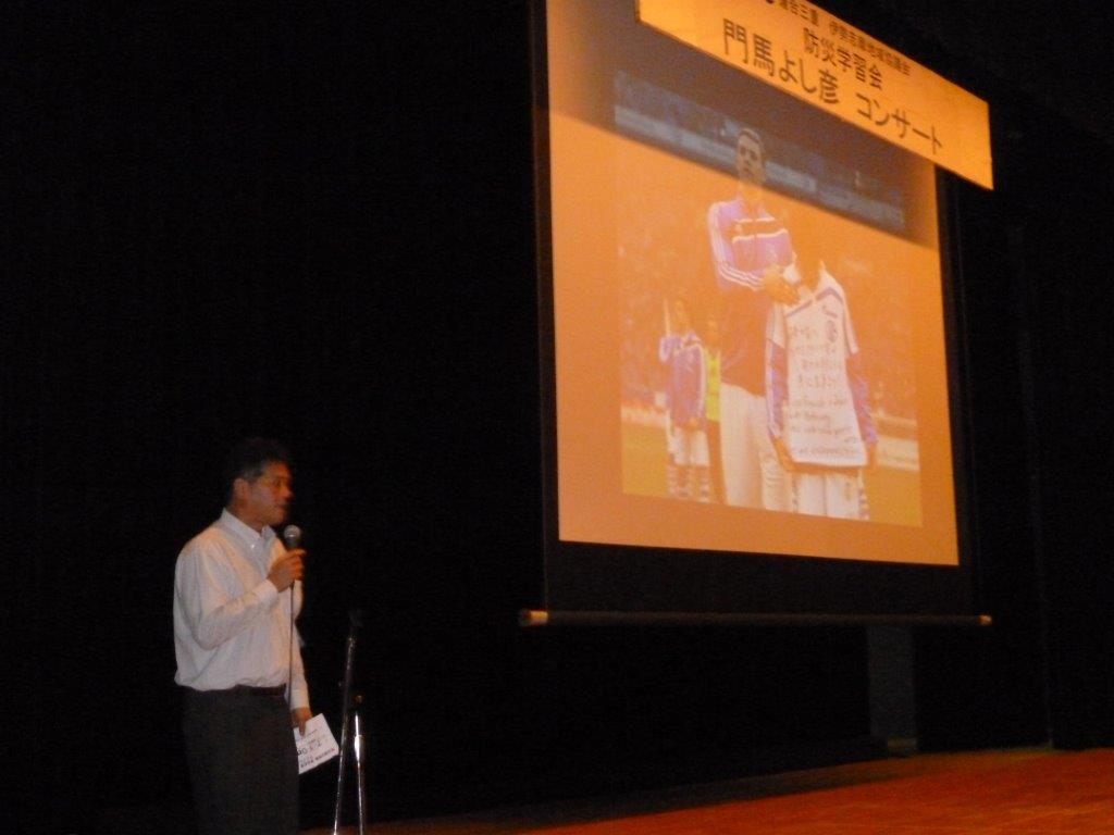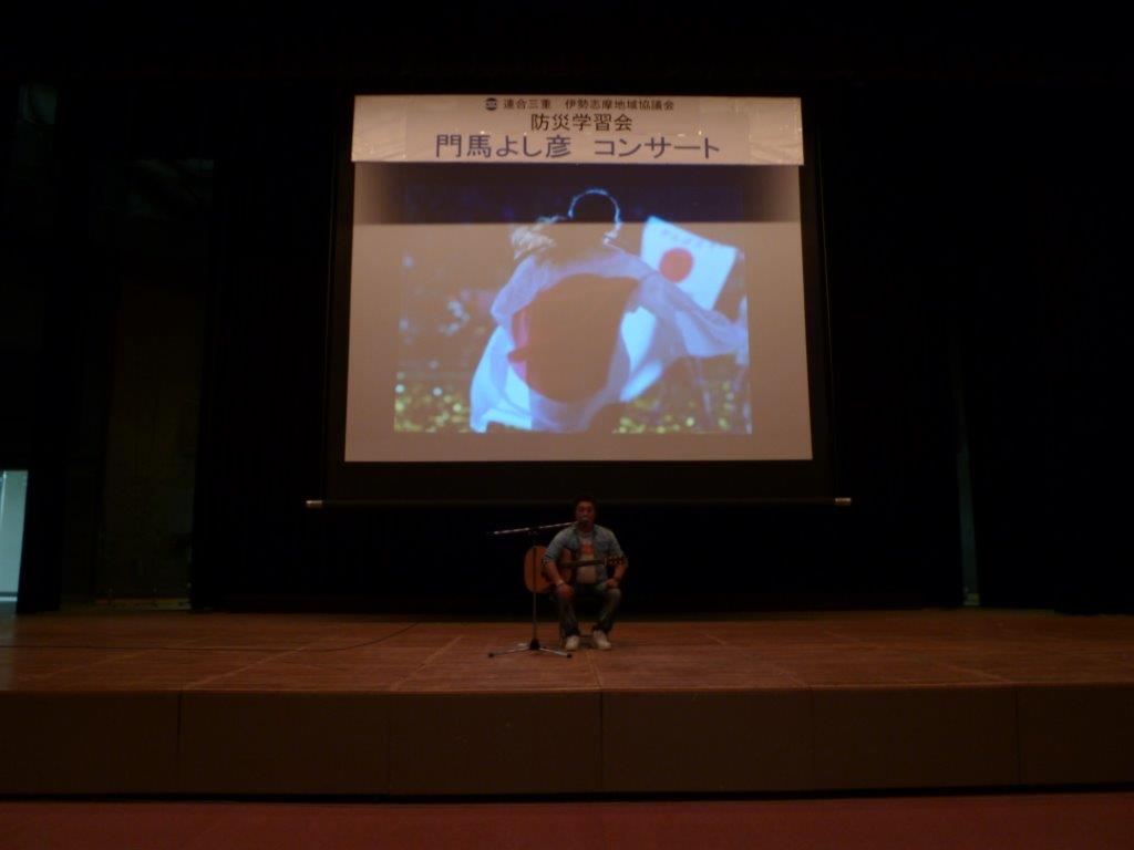 例年、講演を中心とした防災学習会を開催していましたが、今年は東日本大震 災の被災地である福島県浪江町出身のシンガーソングライター、門馬よし彦氏を招いて「防災減災啓発・東北支援ライブコンサート」を開催しました。会場の伊 勢市ハートプラザみそのには、地協構成組織から280名とたくさんの方にお集まりいただきました。コンサートでは、オリジナル曲やカバー曲を熱唱していた だき、トークタイムでは被災地の現状などについて、門馬さんご自身の体験を織り交ぜながら語っていただきました。
