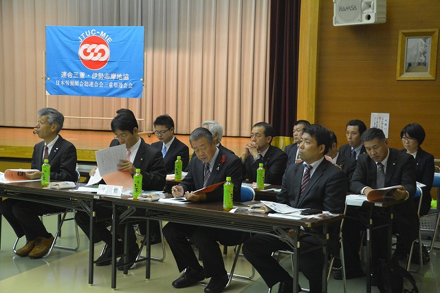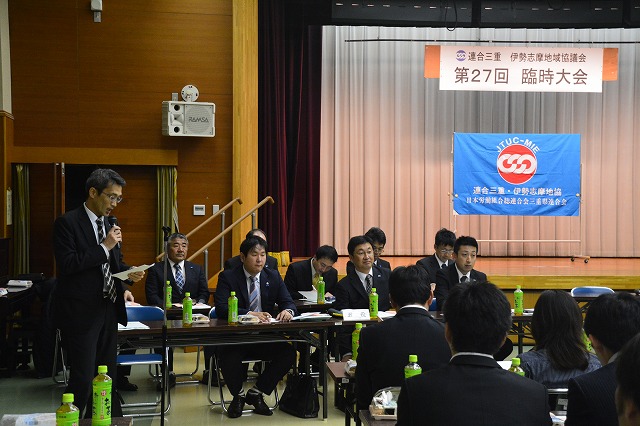 11月25日(金)、伊勢市福祉健康センターにおいて伊勢志摩地協第27回臨時大会を開催しました。 連合三重の藤森事務局長、鈴木伊勢市長をはじめ多数の来賓の方にもご出席いただき、地協加盟単組の代議員の方々と共に、2017年度の運動方針と予算が審議され、地協の運動の方向性が決定されたした。また、特別決議も採択され、すべての働く者の暮らしの「底上げ・底支え」、「格差是正」を推し進めることが確認されました。