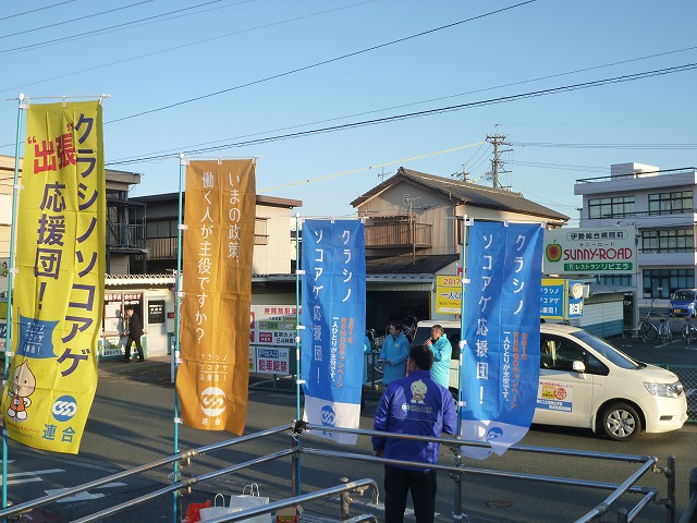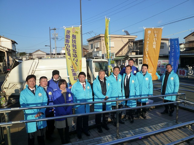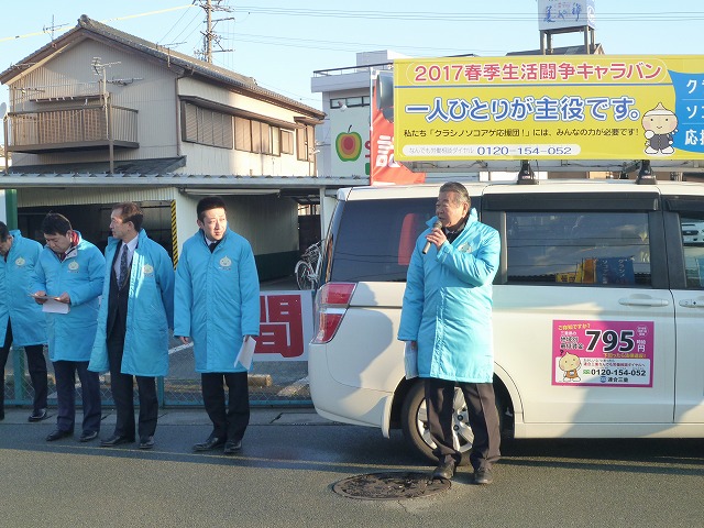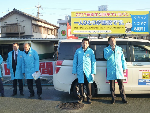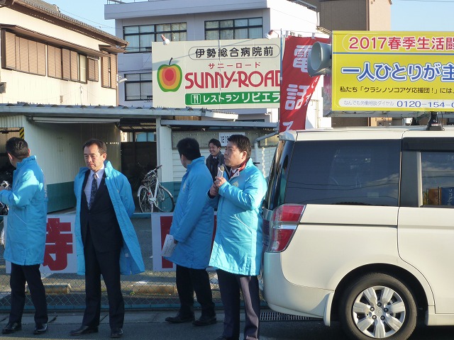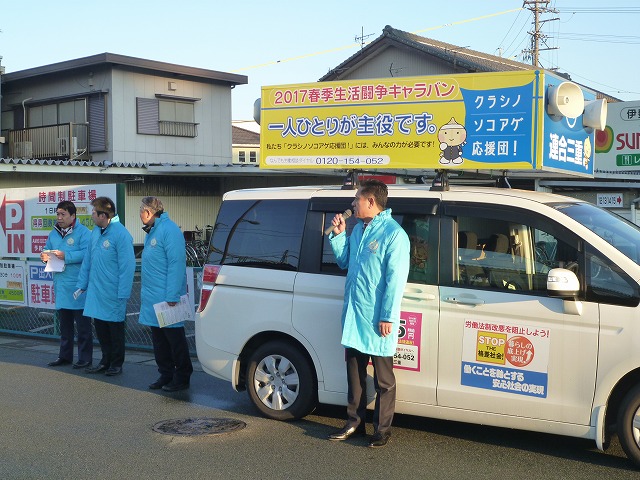 2月6日(月)、伊勢市駅北口および宇治山田駅前において、春季生活闘争街宣行動を行いました。連合三重から吉川秀治会長、県議会の中村進一議長と廣耕太郎議員、民進党から藤田大助5区総支部長を弁士としてお迎えし、長時間労働の是正や非正規雇用労働者の処遇改善などについて、訴えていただきました。また、伊勢市議会の西川則夫議員、世古明議員、上村和生議員、玉城町議会の前川さおり議員にもご参加いただき、地協役員と共にアピールを行いました。