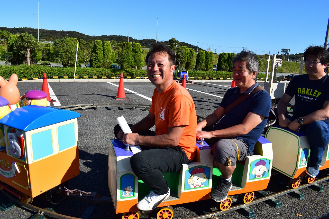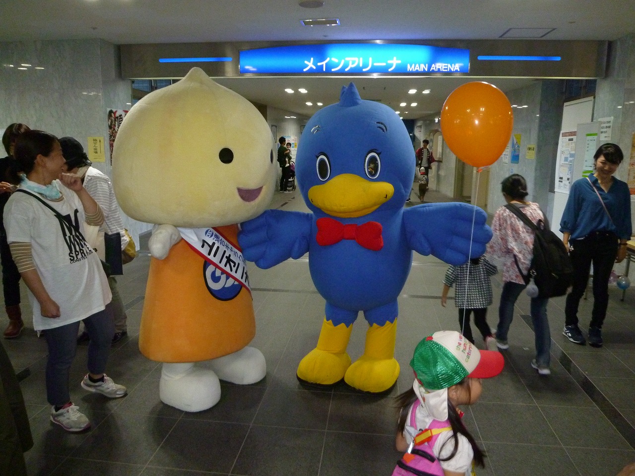 屋内ではキャラクターショーや企業展、環境展、屋外では単組が分担して、やきとり・フランクフルト・揚げたこ・カレーライスなど充実した出店があり、来場者に喜ばれました。子ども向けの乗り物を担当した、三教組の重鎮も電車に乗ってご機嫌のようでした。地協女性委員会は連合のゆるキャラ‘ユニオニオン’と一緒に最低賃金周知のティッシュ配りを行いました。東海労金の‘ロッキー’とのコラボで子どもたちの人気を集めていました。約18000人の来場者があり、最後は大抽選会が行われ、盛況の内に終了となりました。