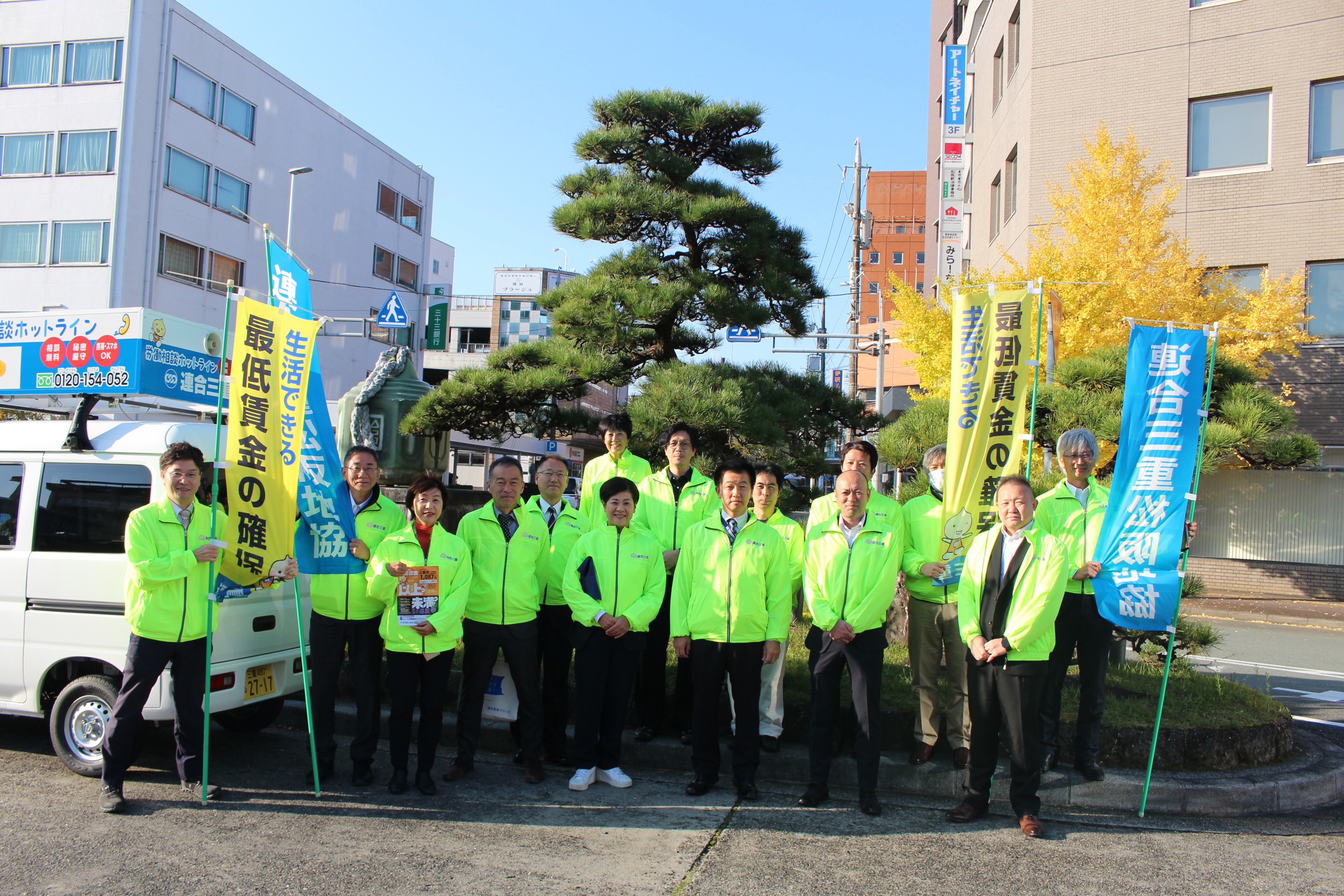 11月7日(金)午前7時30分から、松阪駅JR側ロータリーにおいて「最低賃金の周知」をテーマに街宣行動を行うとともに、連合三重作成のチラシ入りポケットティシュの配布行動も行いました。 連合三重番条会長、松阪多気地域協議会役員7名、新政策議員フォーラム松阪多気の県議・市議6名が参加し、 街頭演説では、松阪地協伊藤議長、