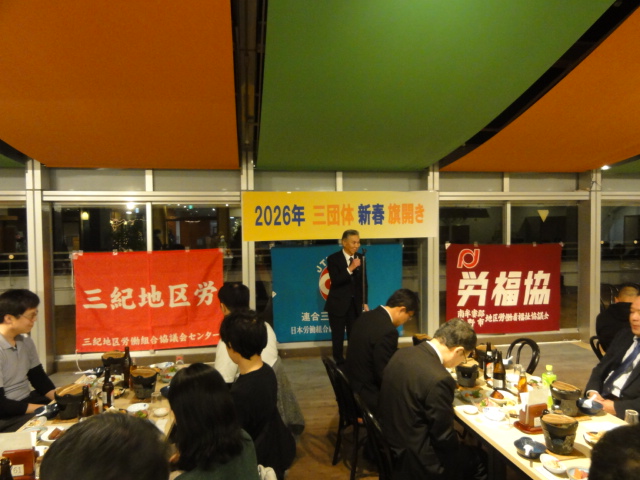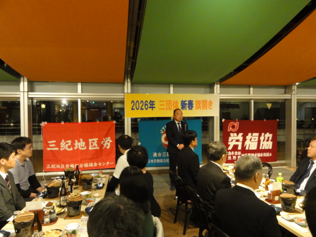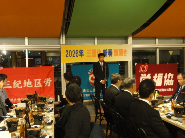 去る1月30日(金)御浜町ごちそうダイニングとりいちにおいて紀南地区三団体(連合三重紀南地協・南熊地区労福協・三紀地区労センター)による新春旗開きを開催しました。連合三重より藤田事務局長、河上熊野市長、大畑御浜町長、萬浪紀宝町副町長、藤根県議など多数の来賓の方々にお越しいただき、各単組組合員とともに今年度の活動をスタートさせる懇親を深めることができました。