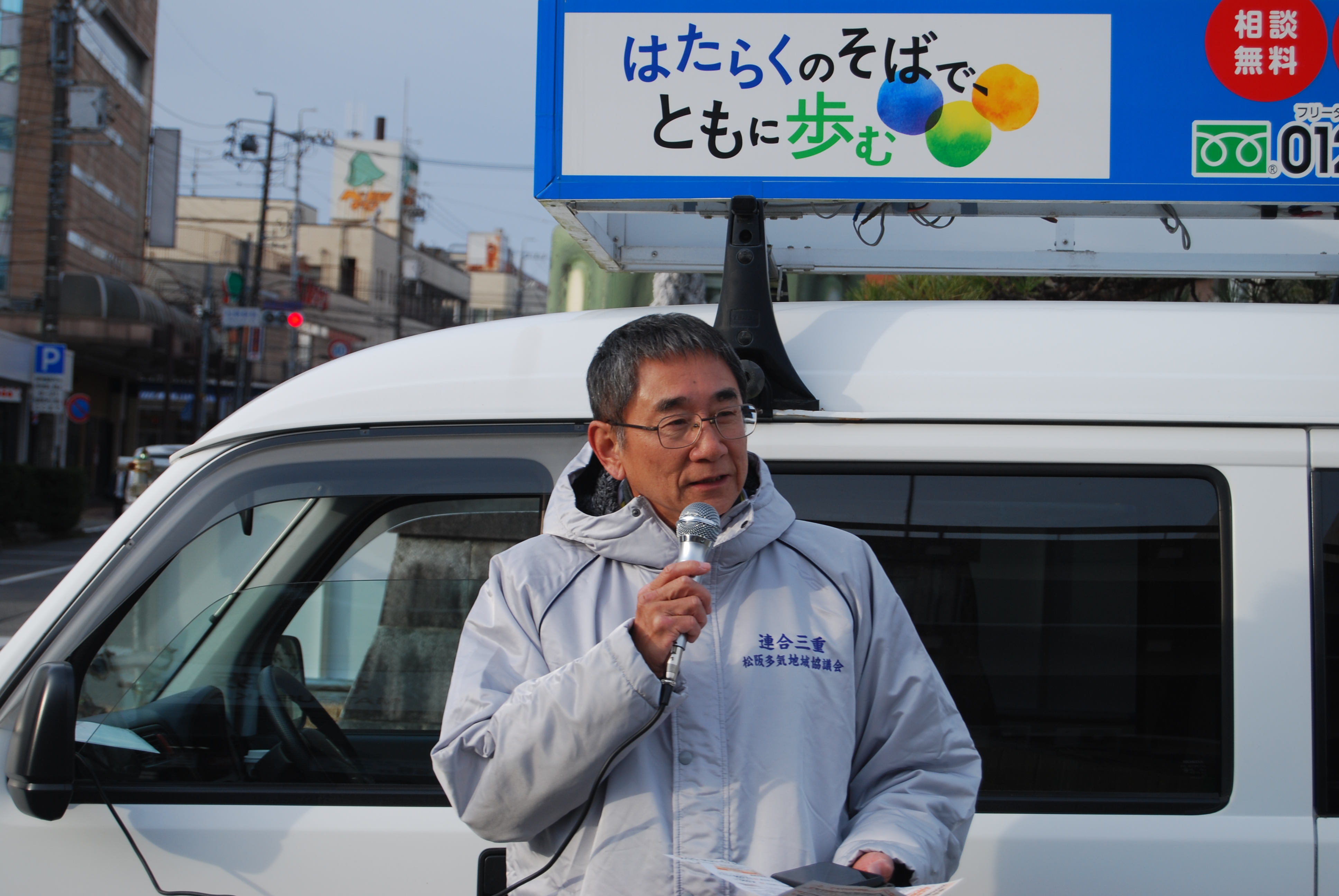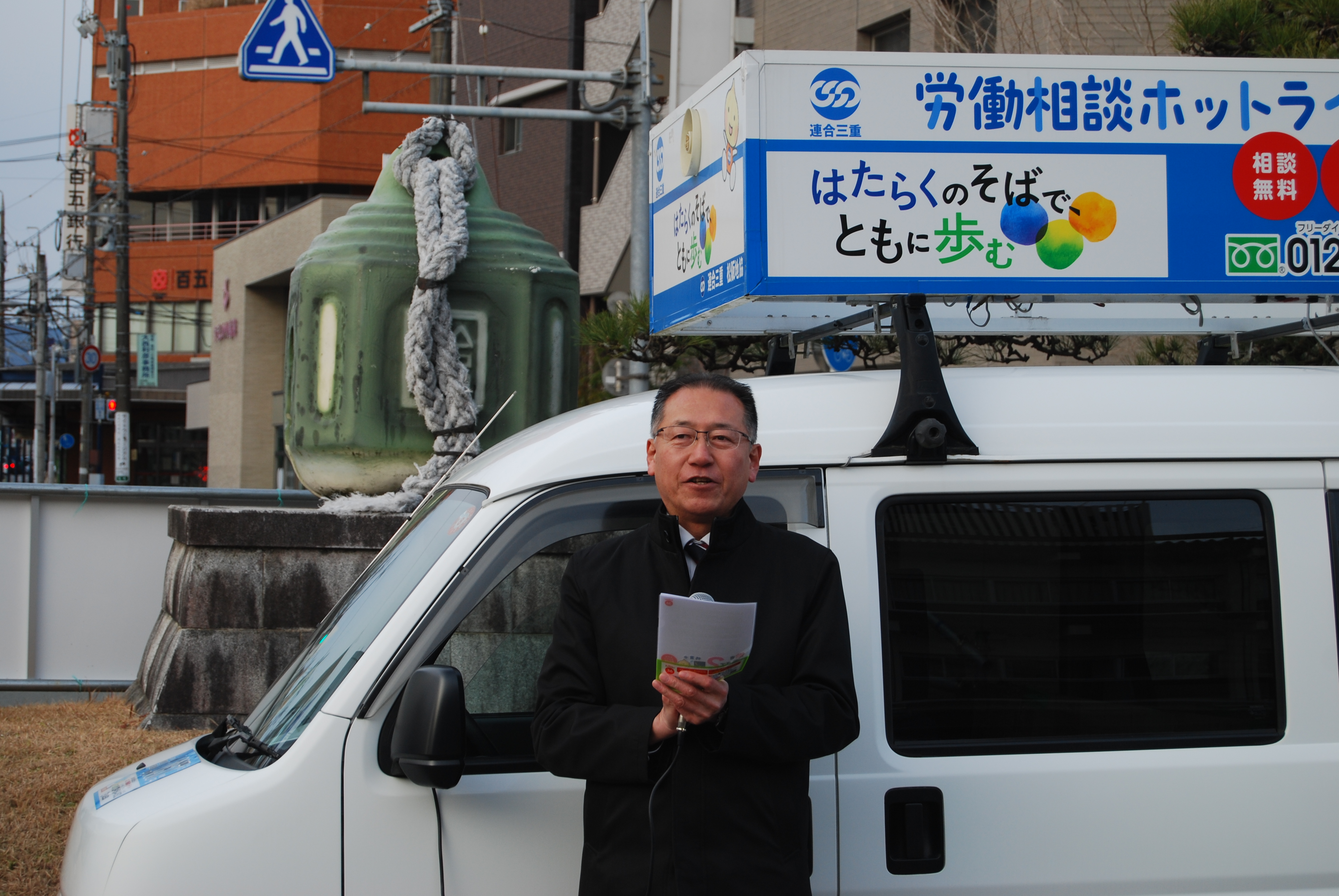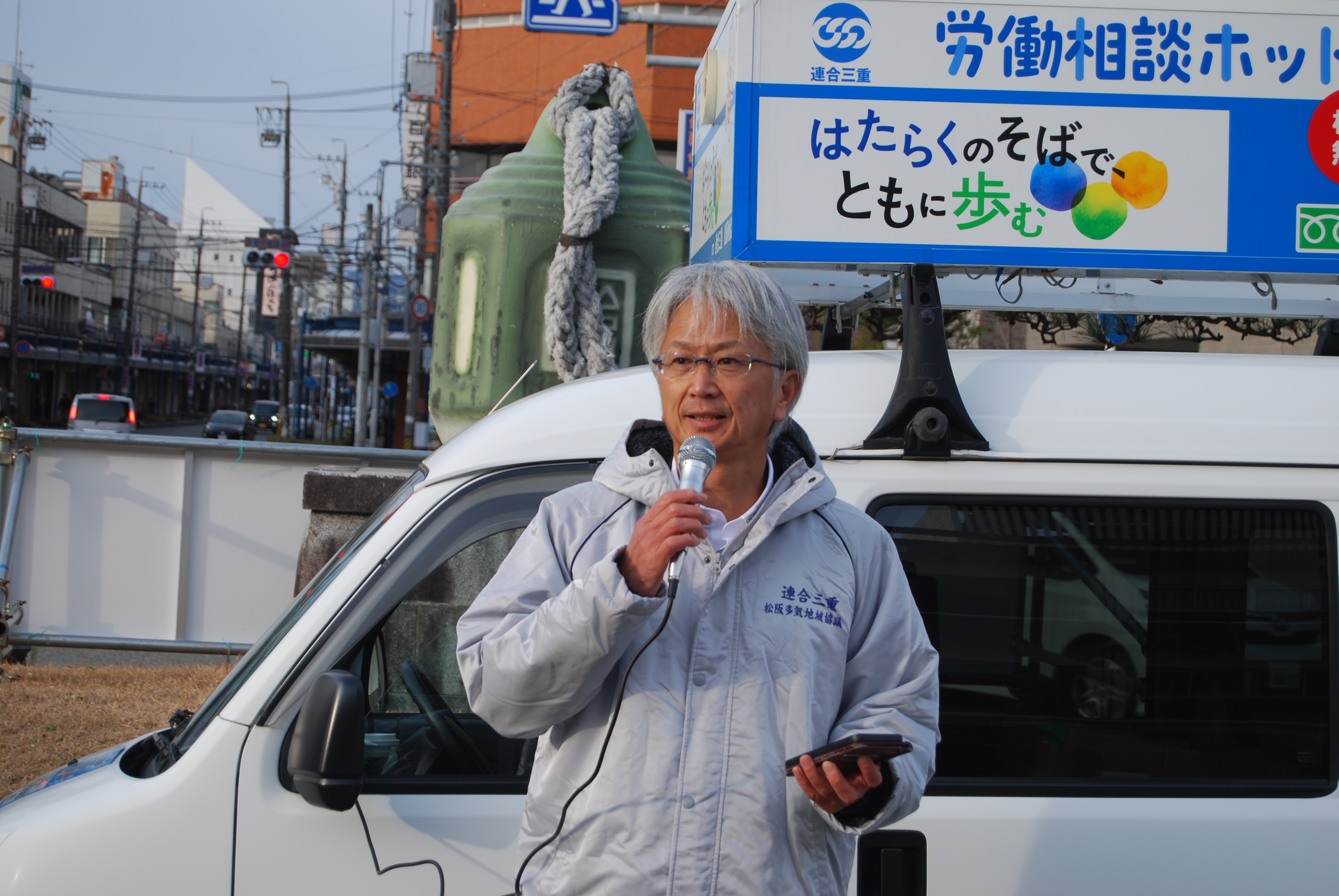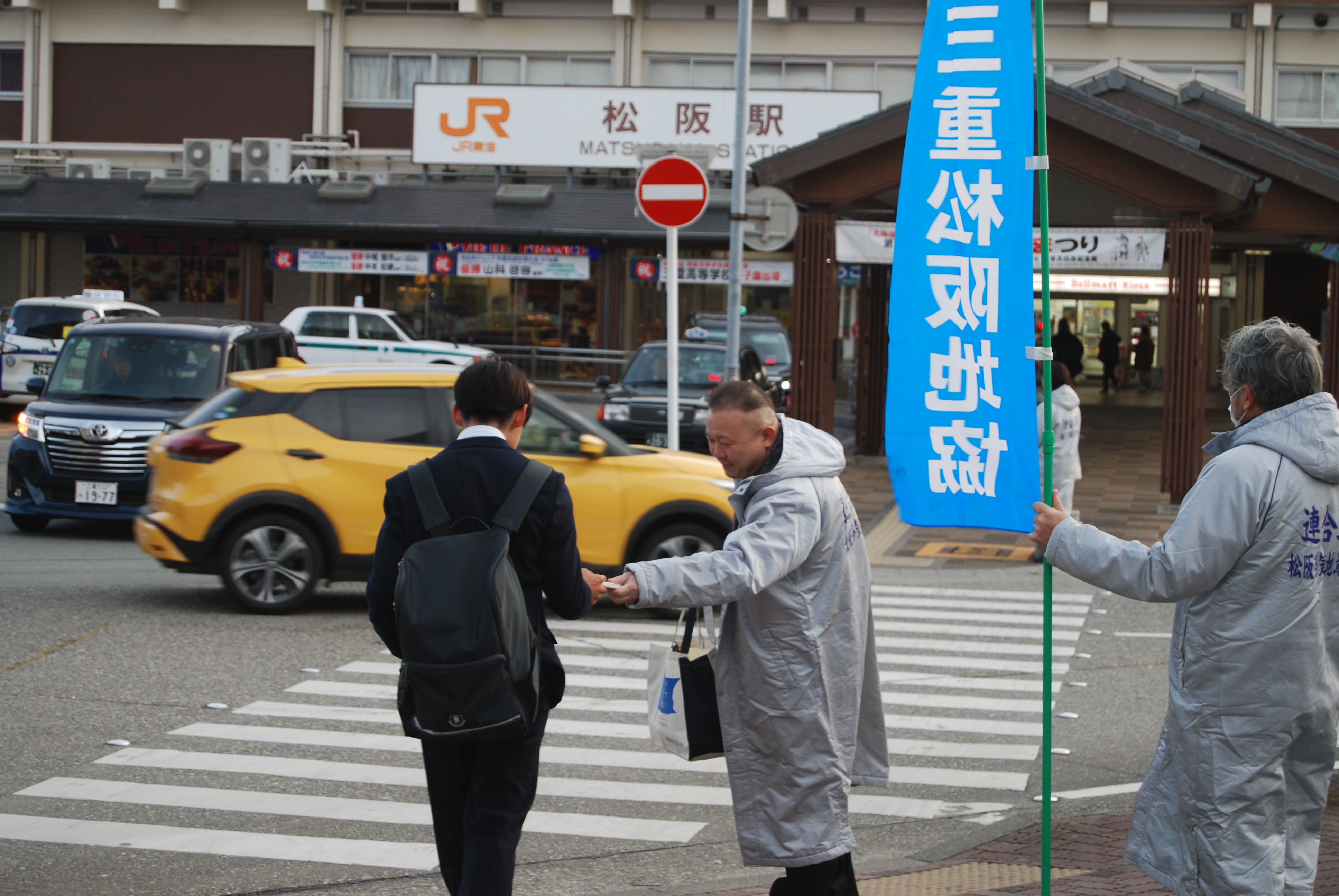 2月17日(火)7時30分から松阪駅JR側ロータリーにおいて、連合三重松阪多気地域協議会は2026春季生活闘争「こだわろう!くらしの向上 ひろげよう!仲間の輪」をテーマに、連合三重番条会長、松阪地協伊藤議長、松阪地協役員に加え、松阪地協と日頃から連携し活動している、新政策議員フォーラム松阪多気の中瀬古県議、喜田県議、楠谷市議、橘市議、吉川市議、酒井市議により街頭演説やチラシ入りポケットティッシュの配布行動を行いました。